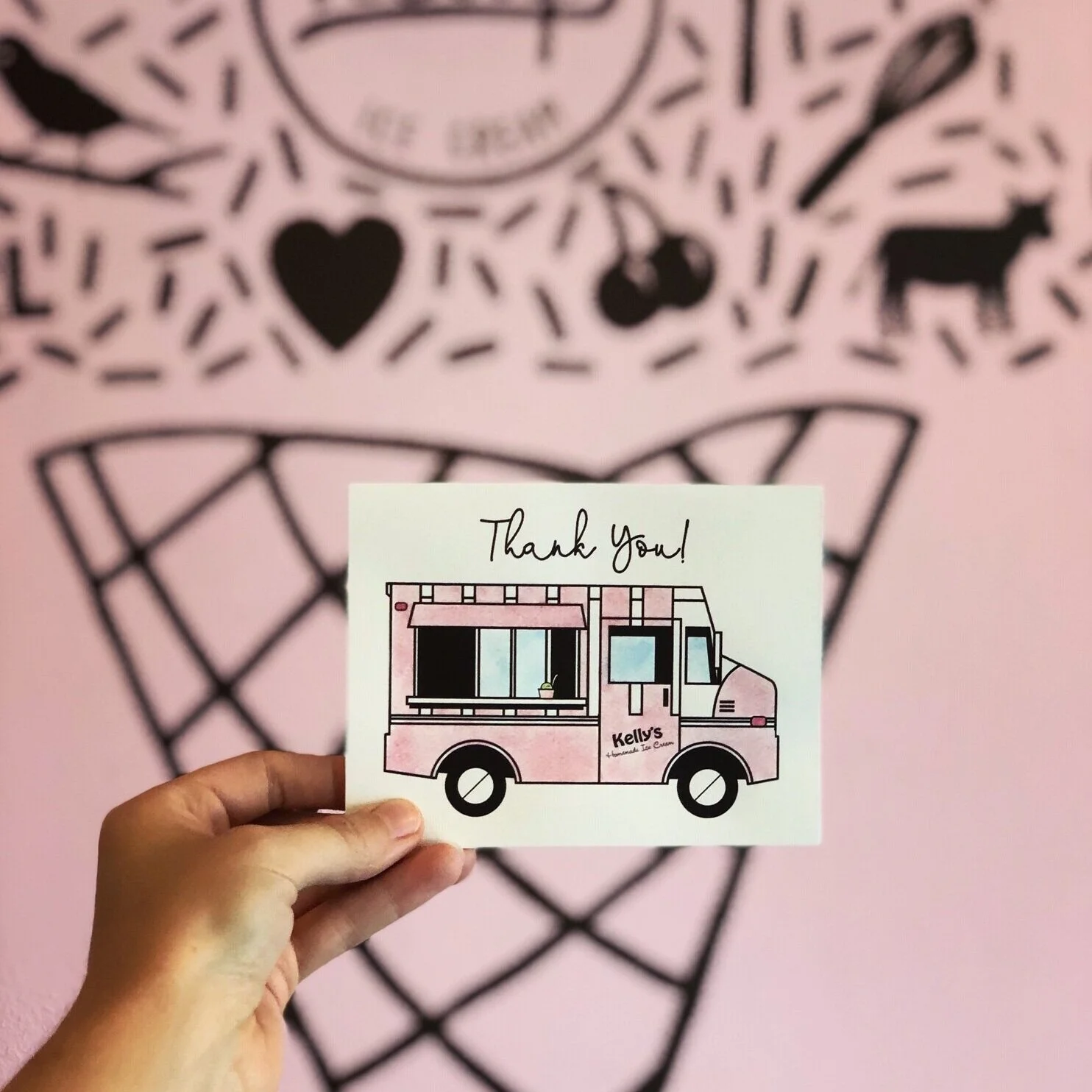 I teamed up with the very delicious Kelly’s Homemade Ice Cream to create a custom Thank You card for clients that rent their ice cream truck or cart for events. Kelly wanted the design to reflect the truck itself and incorporate elements of her business, including their well-known pink and white coloring.